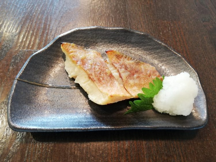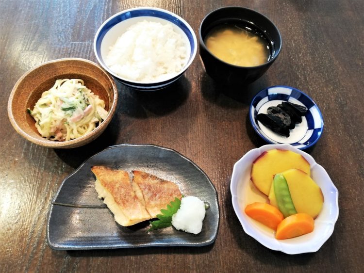 ご飯、かきたま汁、赤魚の粕漬け焼き、さつま芋の煮物、スパゲティサラダ、なす漬け