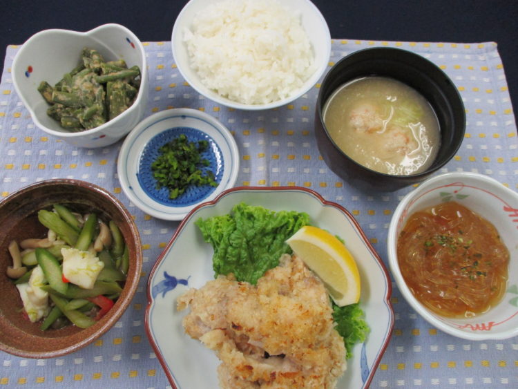 ご飯、えび団子とねぎのみそ汁、鶏肉のパン粉焼き、アスパラといかのソテー、ところてん、いんげんごま和え、青じその実漬