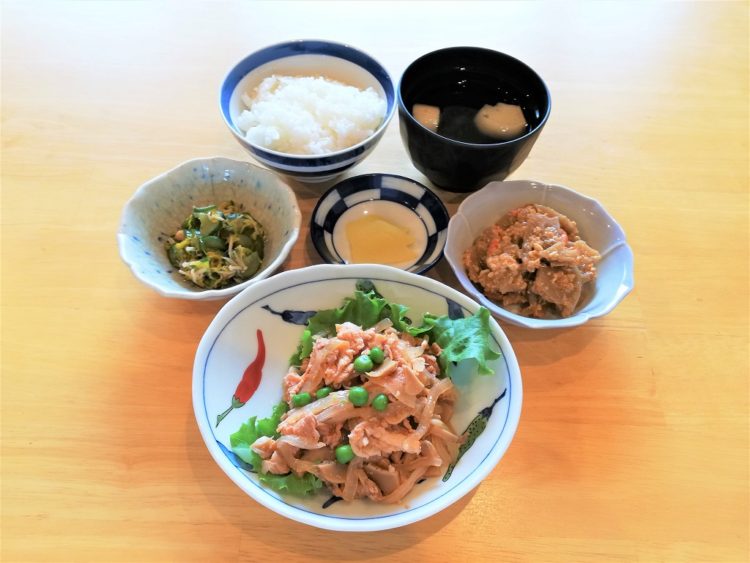 ご飯、観世麩のすまし汁、ポークケチャップソテー、レンコンの炒め物、胡瓜のおかか和え、