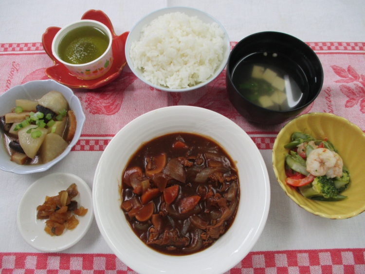 ご飯、オクラと豆腐のスープ、薄切り牛肉のハヤシライス、アスパラとえびのサラダ、かぶと椎茸の含め煮、福神漬、青りんごゼリー