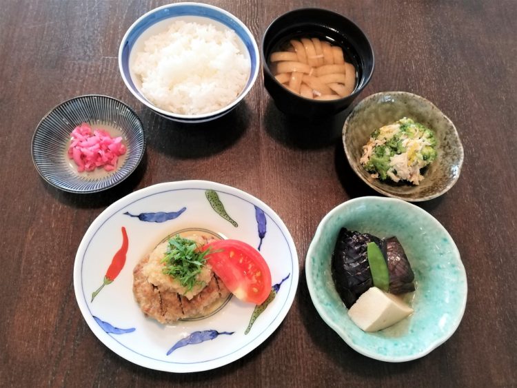 ご飯、板麩のみそ汁、和風おろしハンバーグ、なすと高野豆腐の生姜煮、ごまダレサラダ、梅吹雪