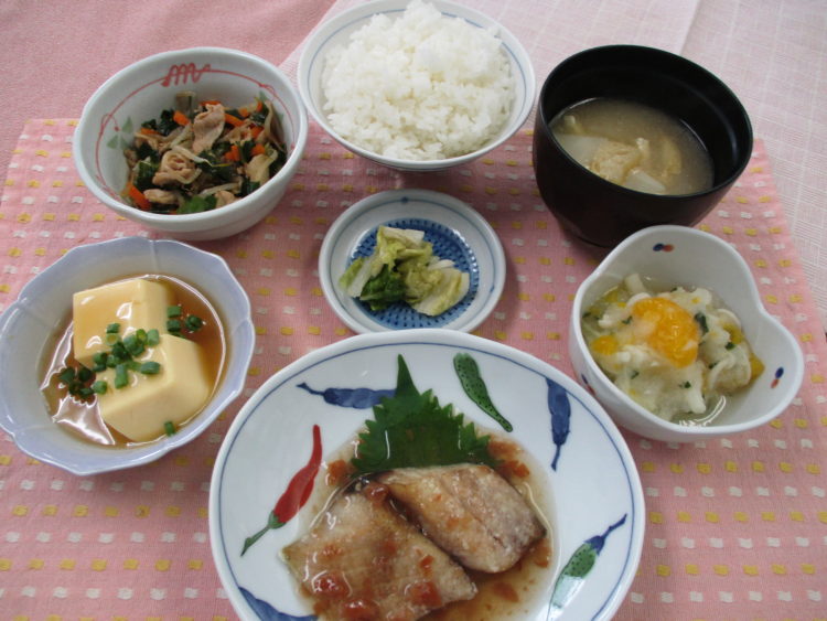 ご飯、かぶと油揚げのみそ汁、あじのソテー梅ソース、豚ニラ炒め、卵豆腐のあんかけ、ぶなぴーの甘酢おろし和え、白菜漬