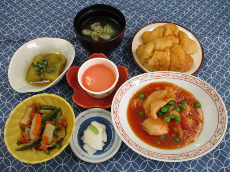 メープルキャラメルクロワッサン、あさりとねぎのスープ、鶏肉のトマトソース煮、いんげんとさつま揚げの炒め煮、焼きなすの生姜煮、白かぶ漬、さくらんぼゼリー