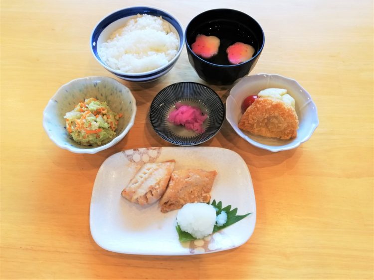 ご飯、花麩のすまし汁、赤魚のしょうゆ糀焼き、ポテトコロッケ、こんにゃくのずんだ和え、