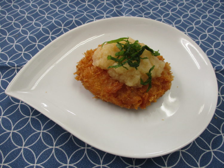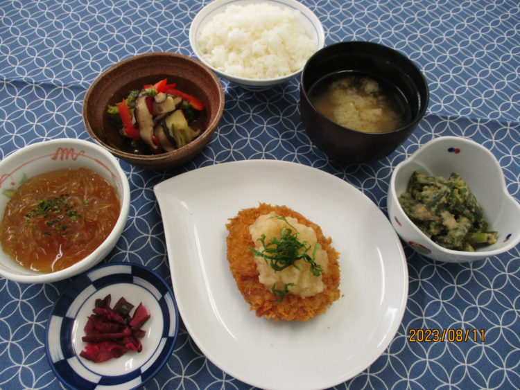 ご飯、なすと油揚げのみそ汁、とんかつおろしポン酢、ブロッコリーといかのソテー、ところてん、いんげんのごま和え、しば漬