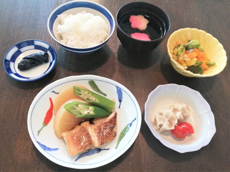 ご飯、花麩のすまし汁、メバルの煮つけ、蒸ししゅうまい、ブロッコリーの炒め物、なす漬け