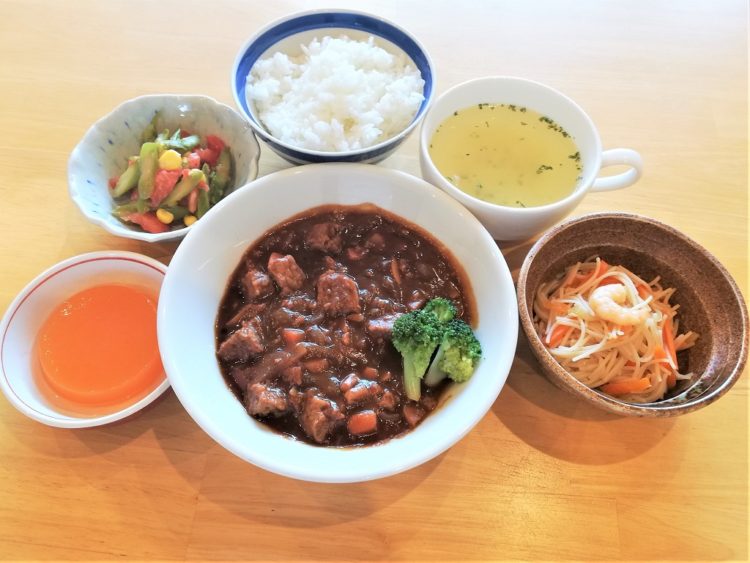 ご飯、コンソメスープ、ハンバーグシチュー、ビーフンソテー、アスパラサラダ、