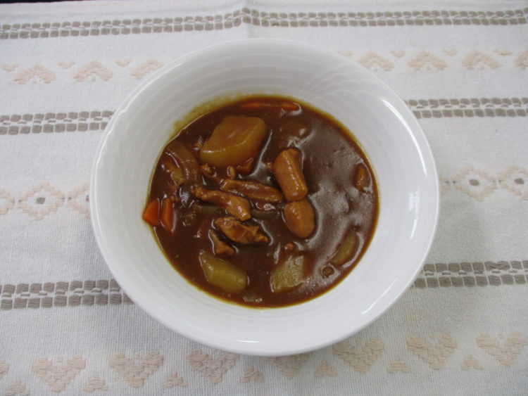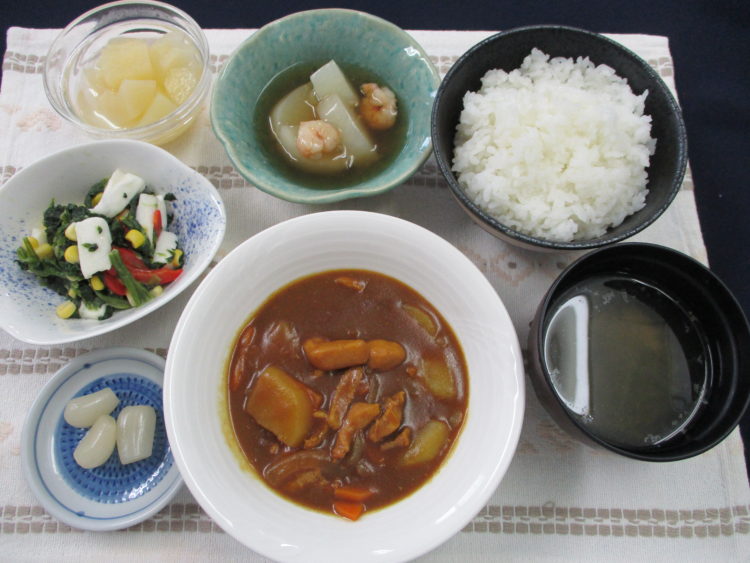 ご飯、めかぶと春雨のスープ、チキンカレー、ほうれん草とコーンのサラダ、ふろふき大根えびあんかけ、らっきょう漬、洋梨缶