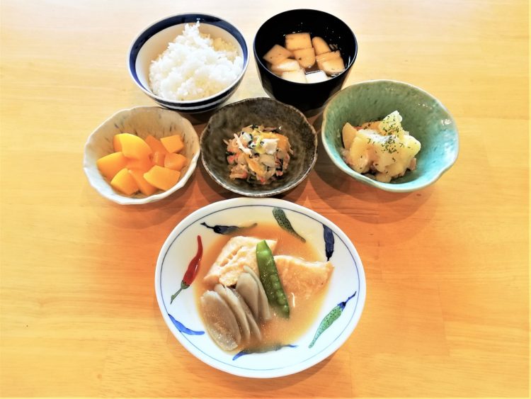ご飯、はんぺんのみそ汁、赤魚の煮つけ、ジャーマンポテト、かぶのサラダ、黄桃缶