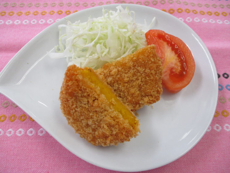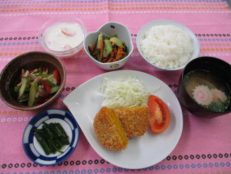 ご飯、なるとと万能ねぎのみそ汁、南瓜コロッケ、アスパラといかのソテー、チンゲン菜のごま和え、わかめ磯漬、みかんヨーグルト