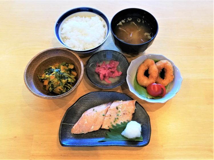 ご飯、なめこのみそ汁、マスのねぎ塩焼き、イカドーナツ、ほうれん草のピーナッツ和え、梅吹雪