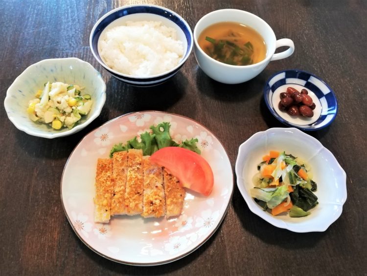 ご飯、ニラのスープ、豚肉のパン粉焼き、青梗菜の炒め物、カリフラワーサラダ、金時豆甘煮