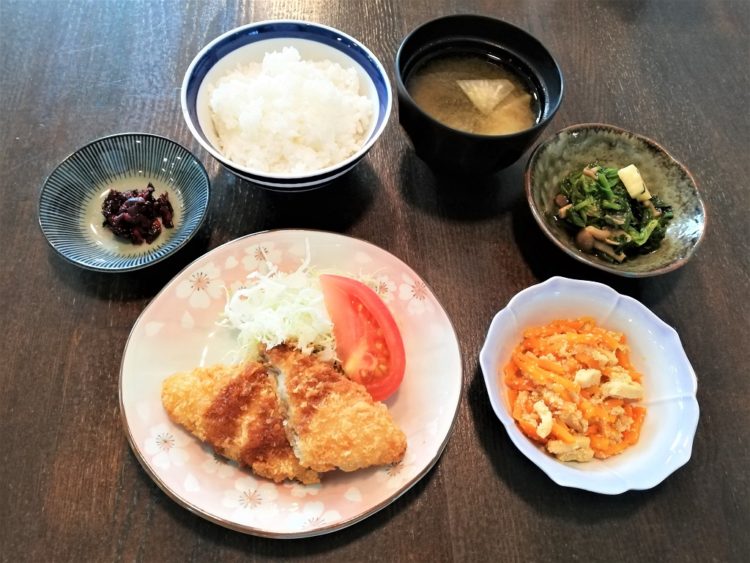 ご飯、かぶのみそ汁、白身魚フライ、人参の子和え、ほうれん草のお浸し、しば漬け