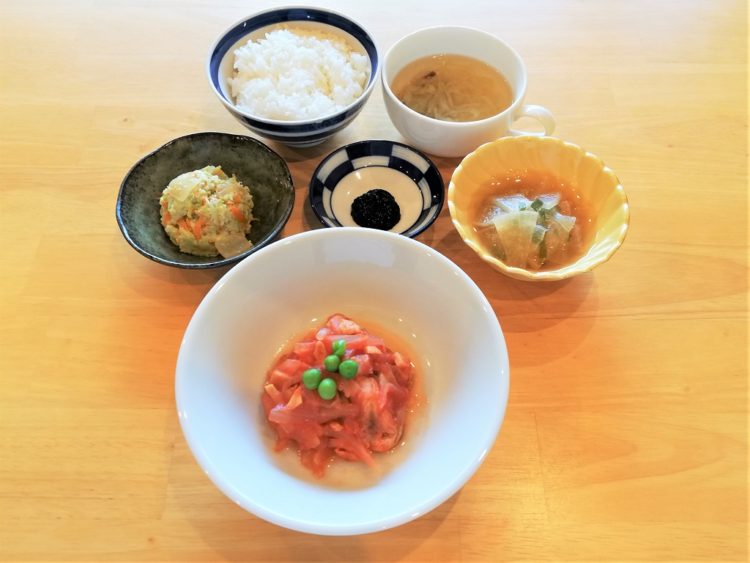 ご飯、キャベツのスープ、鶏肉のトマト煮、大根とあさりの煮物、ずんだ和え、のり佃煮