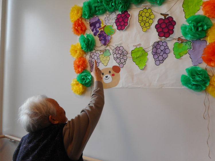 2階はぶどうの壁画です。巨峰・シャインマスカットなど様々混合していますが、塗り絵や貼り絵など作成方法も様々にしてみました。