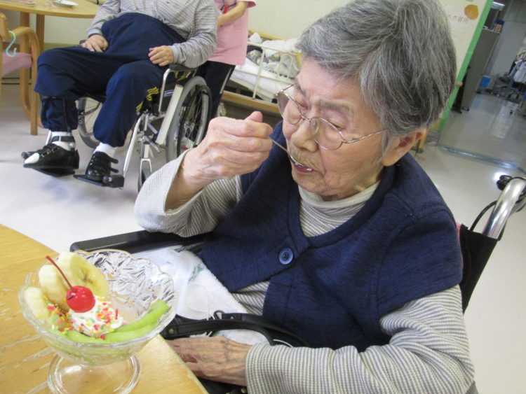 今日のおやつ喫茶は、なんとパフェ。昔喫茶店で誰もが食べたことがあるもの。皆さん思い思いに果物をのせて自分だけのパフェを作り、さあこれから食べるところ.........