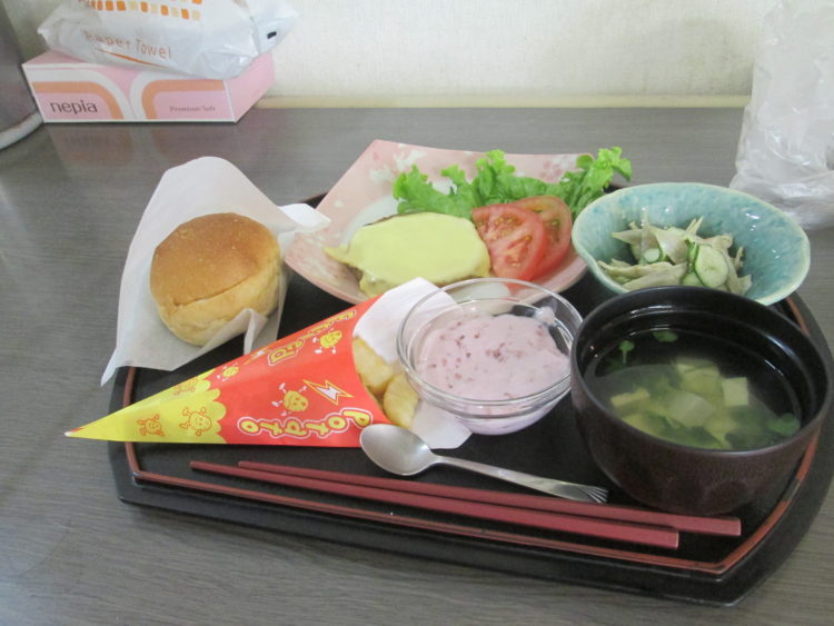 本日、自作のハンバーガー2日目です。左側にあるバンズに、レタス、スライストマト、チーズののったハンバーグを自分で挟んで召し上がっていただきました。後で、...