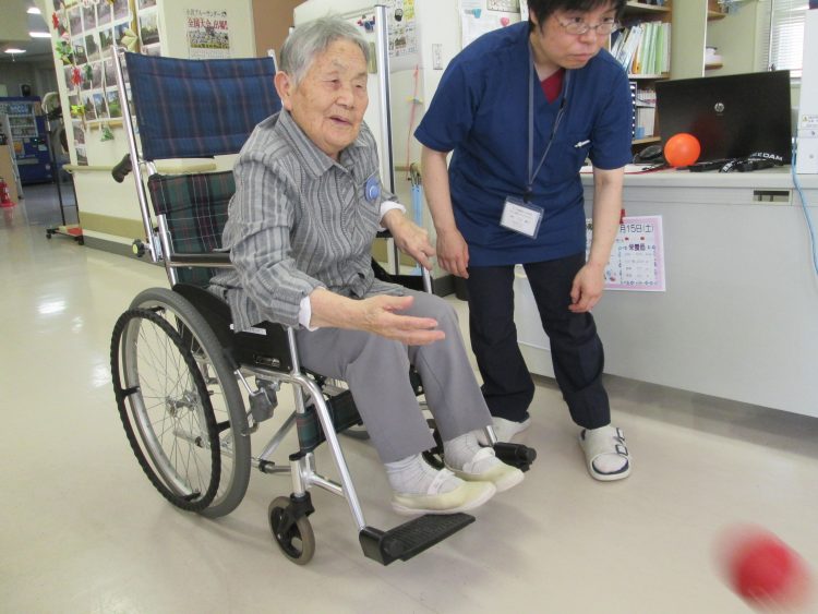 力強くボールを投げるⅠさん、8本倒したよ。車椅子から立ち上がってボーリング、若い時やってたのかフォームが決まってるね。重いボー...