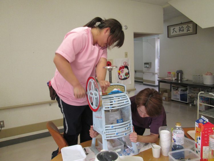 職員が必死になって氷を削ってます。