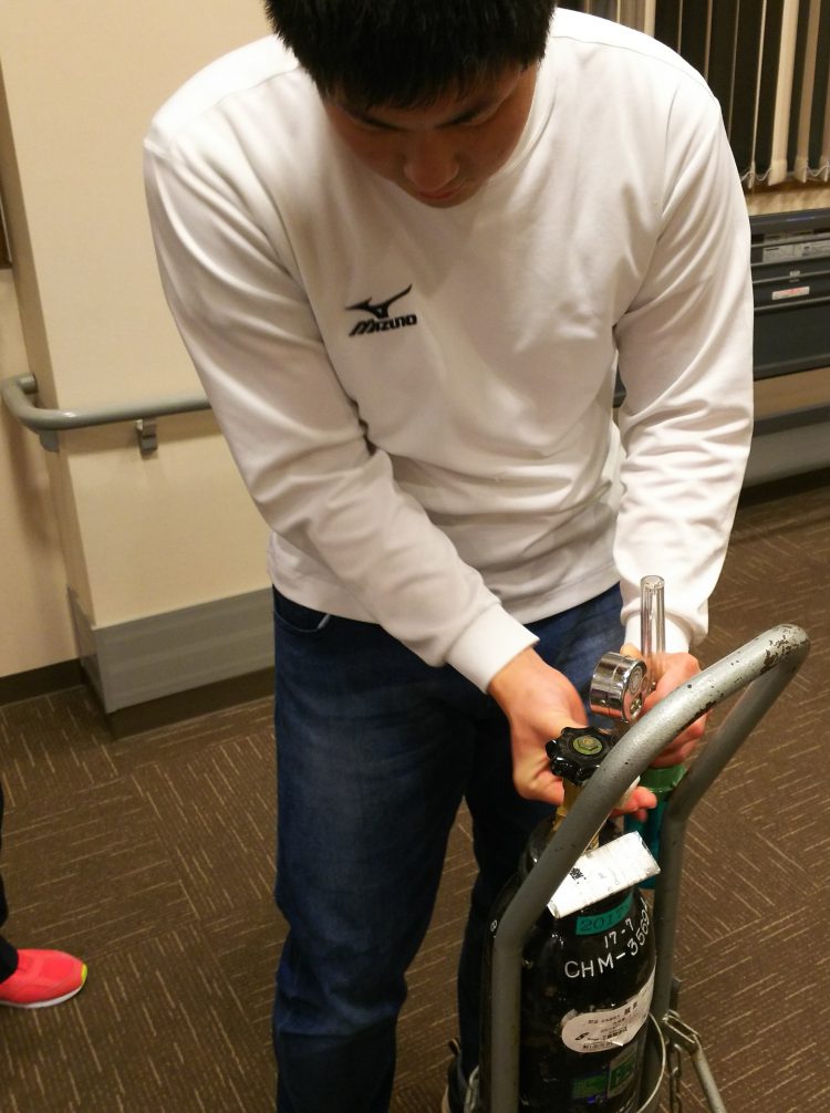 内容としては、酸素ボンベの使用方法等です。介護職員でも何かあった際は対応できなければ...