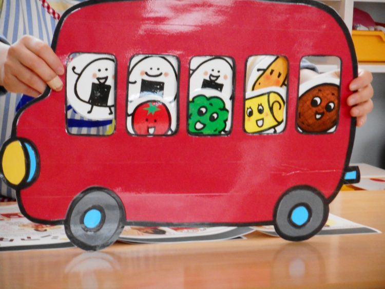 「おべんとうバス」というお話で、野菜が次々にバスに乗って...