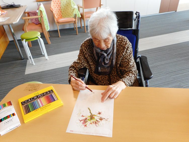 施設内では、天気にも負けず、O様は塗り絵をして、楽しんでます。☆☆