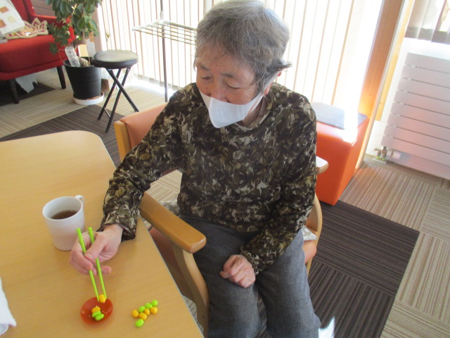 ブログをご覧の皆様こんにちは。 本日のS様の様子をご紹介致します。 入浴後S様と一緒に豆つかみゲームを行いました。 中々お皿に... 詳しく見る