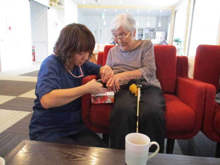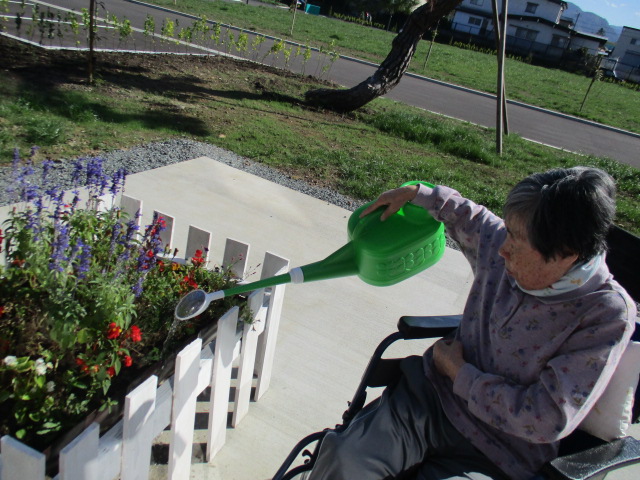 S様、花が好きだとのことで、外に出て花壇に水をあ...