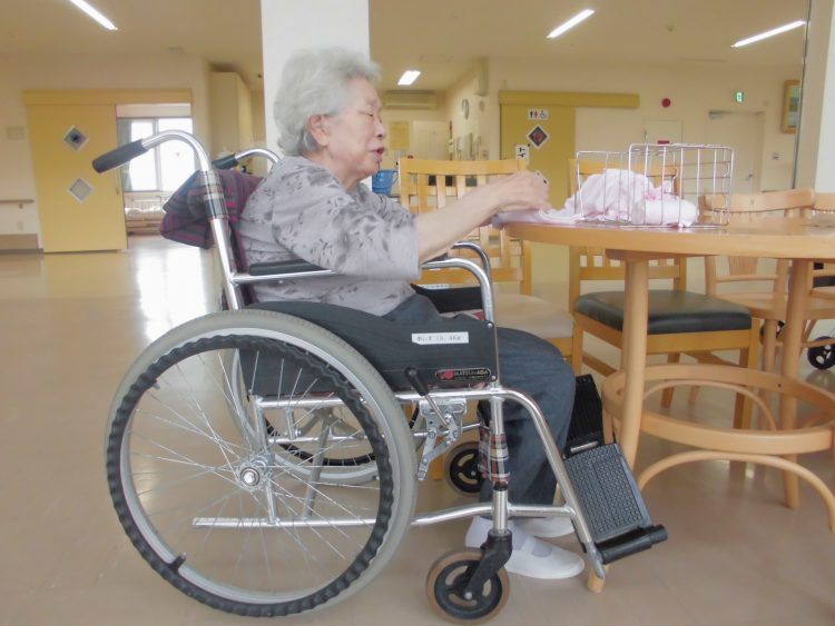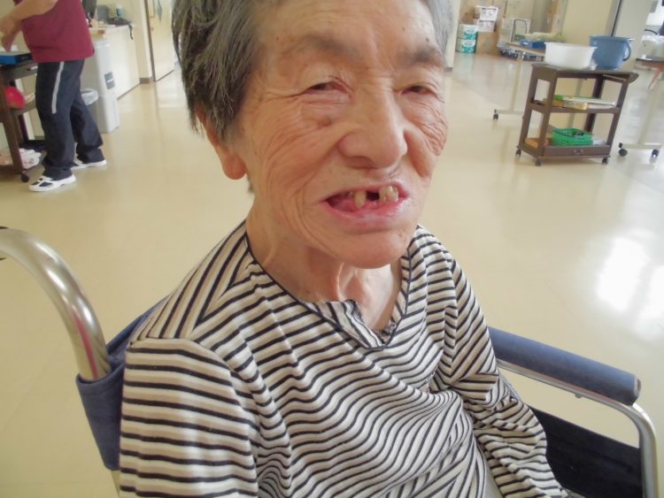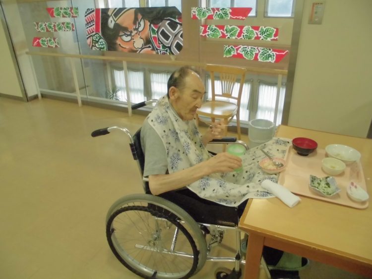 いつも元気なSさん。目が見えない方ですが、食事も一部介助が必要ですが、残さず全量食べます。たまに食べこぼしもありますが
