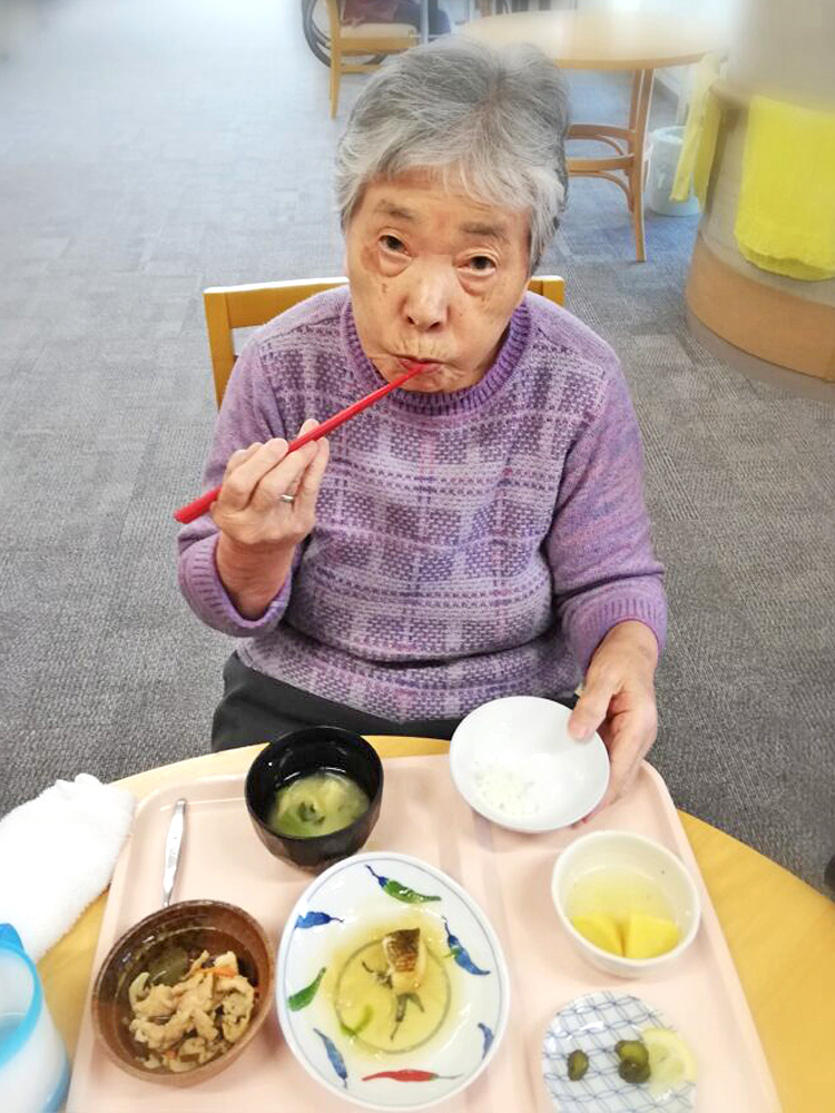 毎日のように歩行器で歩行練習をしているお客様です。ご本人の体調の良い時に行っています。