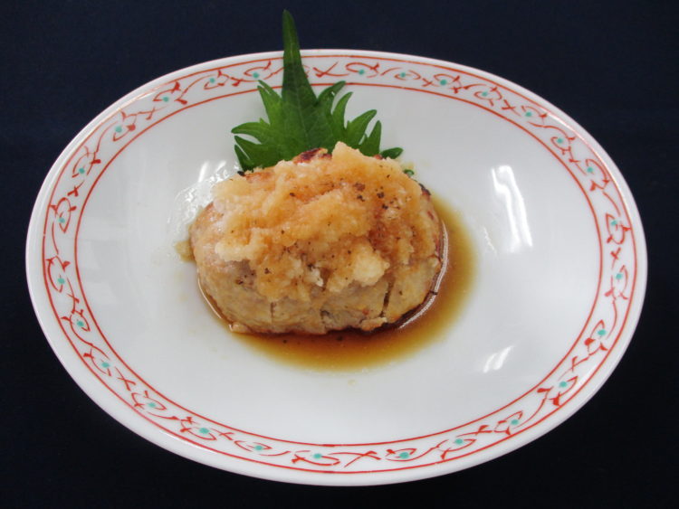 ご飯、焼き豆腐と三つ葉のみそ汁、和風おろしハンバーグ、ブロッコリーとえびのソテー、ほうれん草のごま和え、わかめ磯漬、ラフランスゼリー