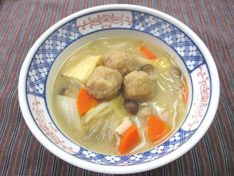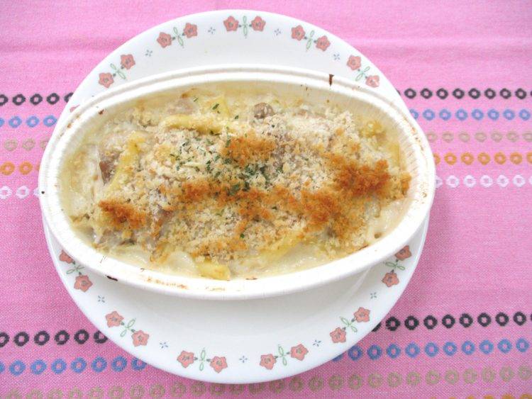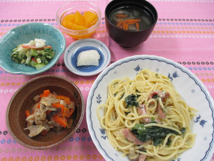 ロールパン、かきたま汁、チキンクリームシチュー、白菜の甘酢炒め、カリフラワーとカニカマのサラダ、ぶどうゼリー