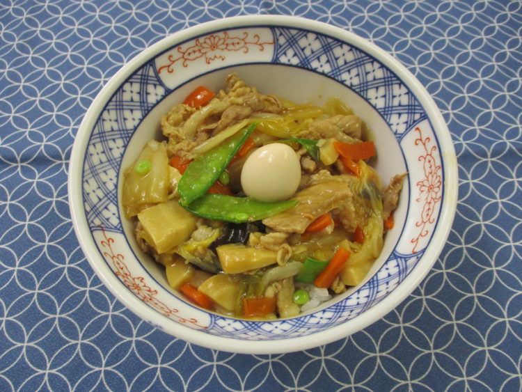 ご飯、キャベツとコーンのスープ、ローストチキン、サーモンのカルパッチョ、なすとベーコンのケチャップ炒め、タマゴパスタ、べったら漬、クリスマス...