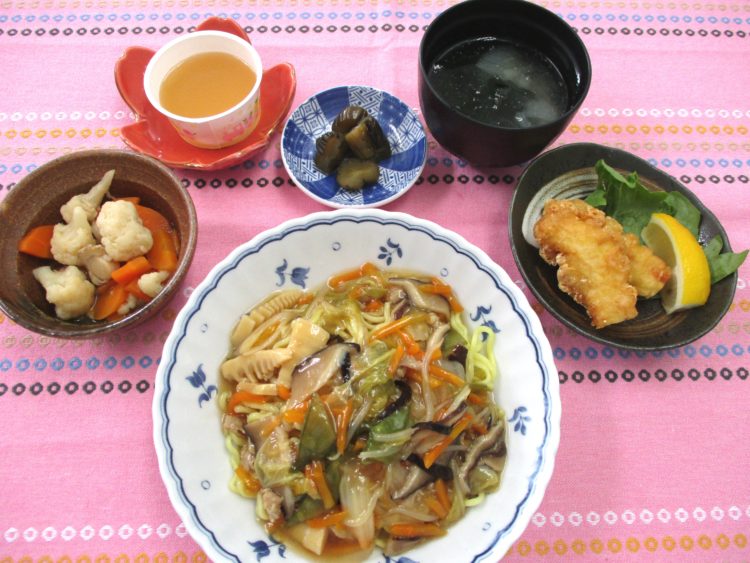<お品書き> あんかけ焼きそば、わかめスープ、鶏天、カリフラワーと帆立のスープ煮、 相馬のきゅうり漬、ももゼリー エネルギー:553㎉ たんぱく... 詳しく見る