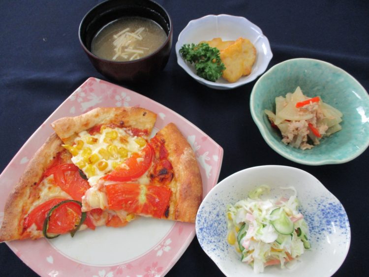 お赤飯、生麩とみょうがの清汁、天ぷら盛り合わせ、茶碗蒸し、帆立とがんもの煮物、桜大根漬、みかん