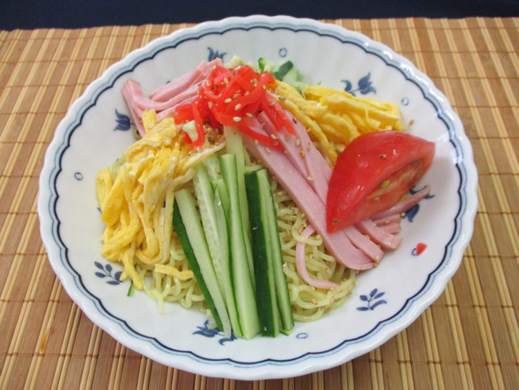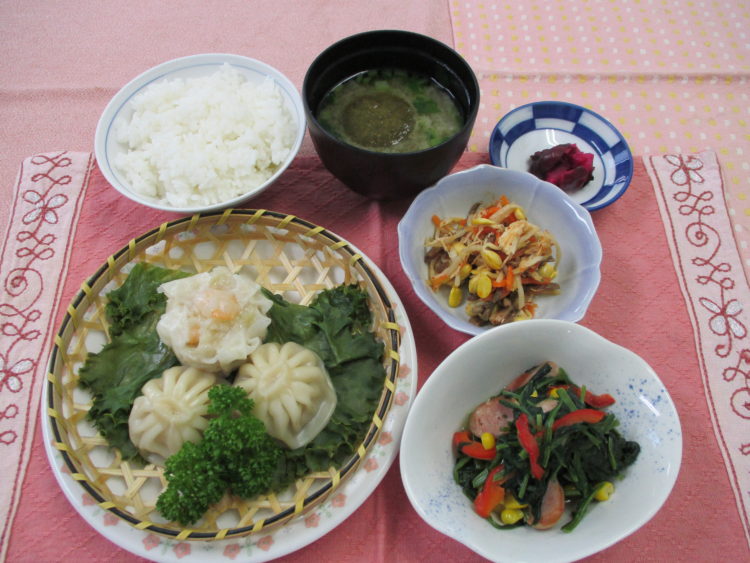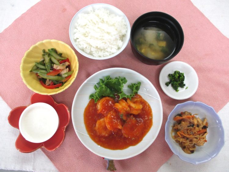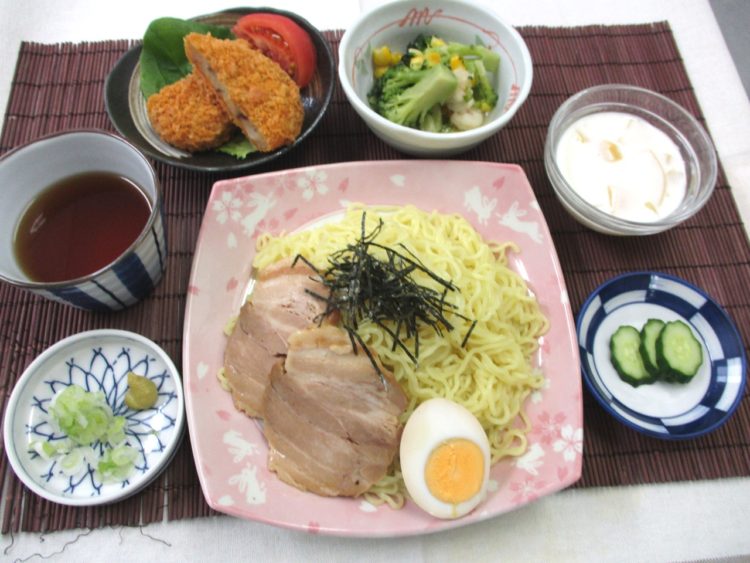 焼きそば、生揚げと万能ねぎのみそ汁、里芋といかの煮物、菜の花と山菜のごま和え、日向夏ゼリー