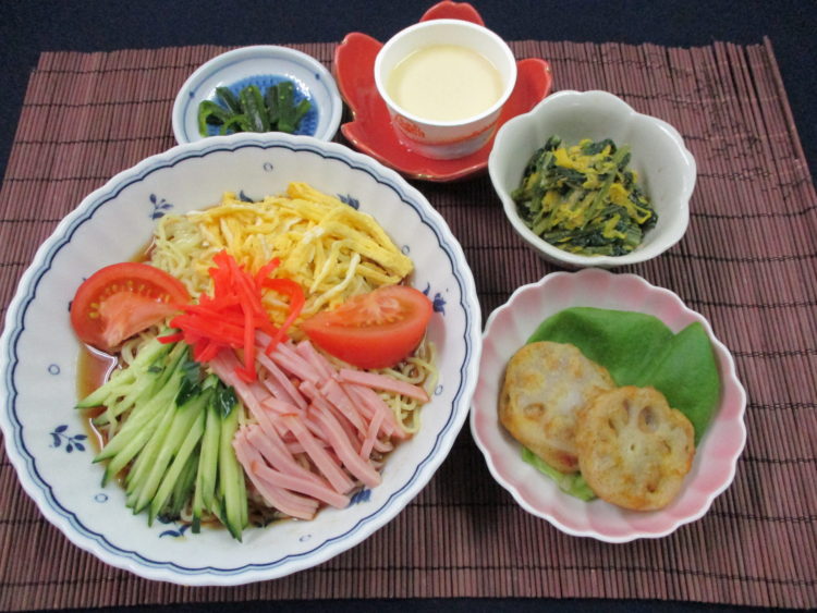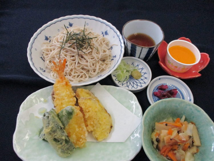 天ざるそば、キャベツとさつま揚げの炒め煮、しば漬、みかんゼリー