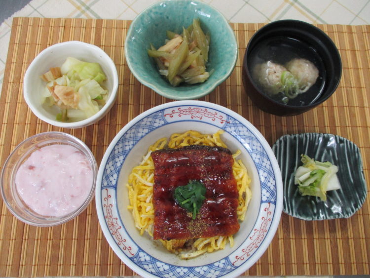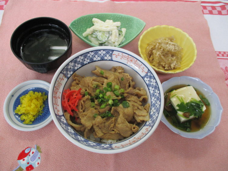 スタミナ丼、わかめスープ、春雨とれんこんのソテー、マカロニサラダ、豆腐のなめこあんかけ、つぼ漬