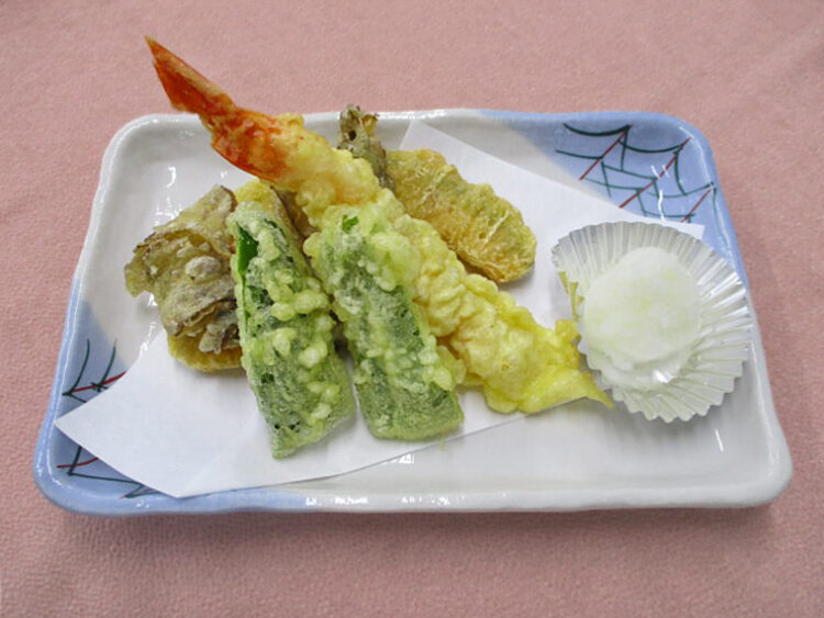 太巻き寿司、菜の花と生麩の清汁、えびの天ぷら、刺身盛り合わせ、南瓜の含め煮、長芋漬、和菓子...