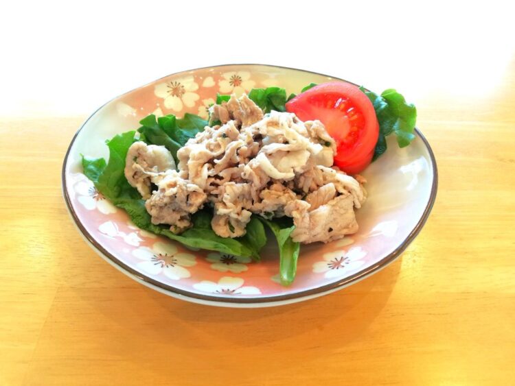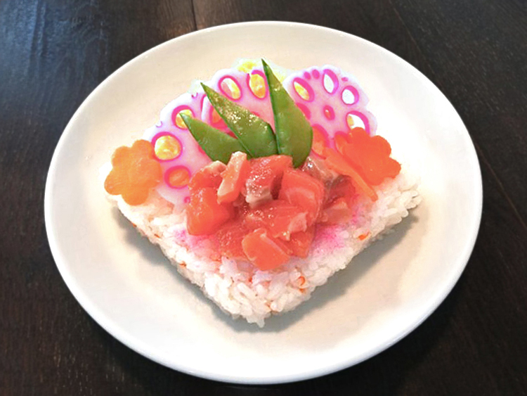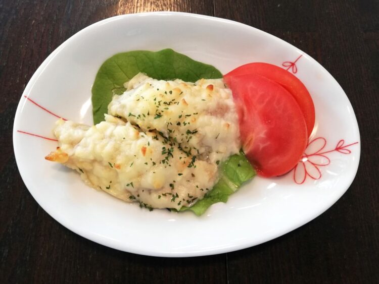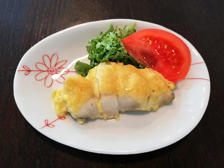 ごはん、わらびのみそ汁、白身魚の甘酢あんかけ、玉子しんじょ、レタスのサラダ、しそ昆布