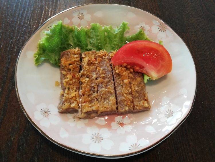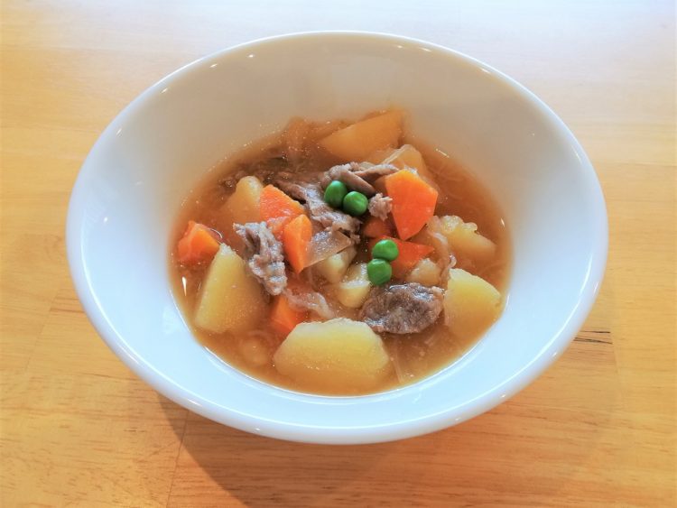 ご飯、コンソメスープ、牛肉のパン粉焼き、大根の炒め煮、カリフラワーサラダ、のり佃煮