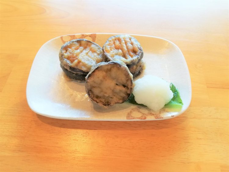 ご飯、板麩のみそ汁、和風おろしハンバーグ、なすと高野豆腐の生姜煮、ごまダレサラダ、梅吹雪