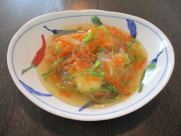 ご飯、オクラのすまし汁、鶏肉の生しょうゆ糀焼き、南瓜の煮物、春雨といかの和え物、
