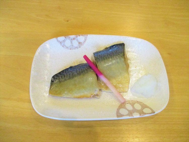 ご飯、細竹のみそ汁、さばのみりん漬け焼き、かぶのかにあんかけ、すき昆布の煮物、