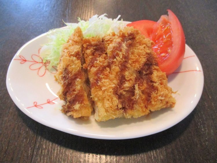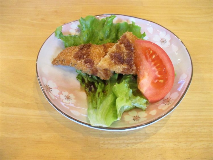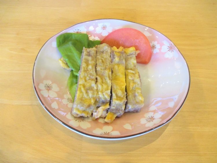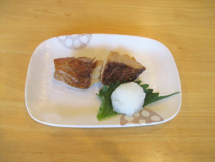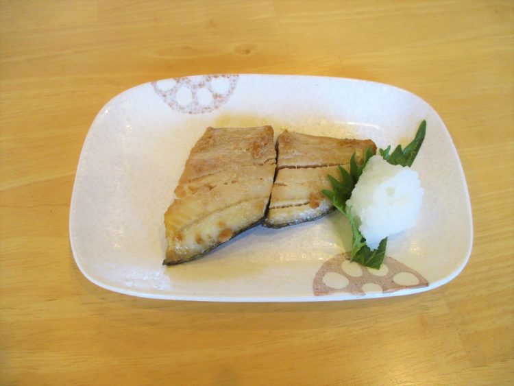 ご飯、麩のみそ汁、たらのホワイトソースがけ、ジャーマンポテト、なすの煮浸し、