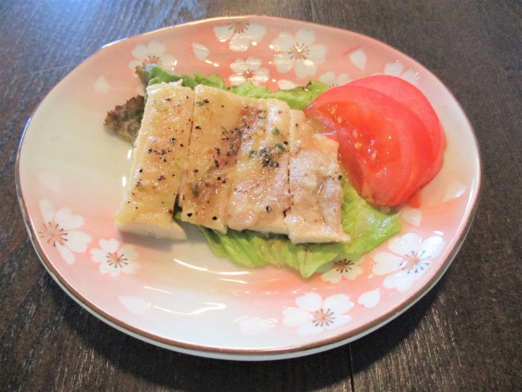 ご飯、ささみのすまし汁、ホッケのなめ茸おろしかけ、玉子と豆腐のしんじょ、なすの炒め物、