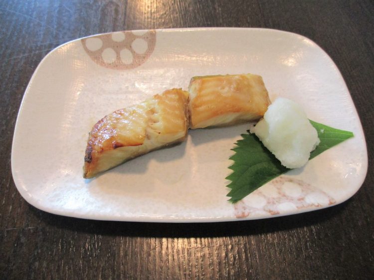 ご飯、豆腐のみそ汁、ホッケの醬油漬け焼き、白菜と帆立の炒め煮、オクラの甘酢和え、