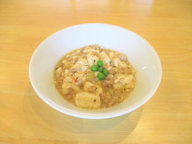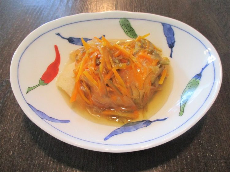 ごはん、えのきのみそ汁、白身魚の野菜あんかけ、豆腐とにらの炒め物、さつまいも煮、