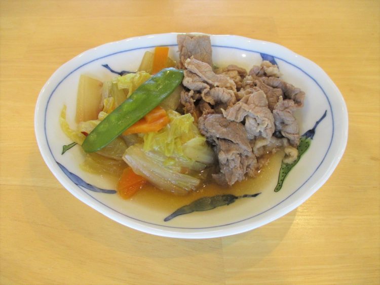 ご飯、大根のみそ汁、牛肉と白菜のすきやき風、かぶの煮物、青梗菜のお浸し、白花豆甘煮、
