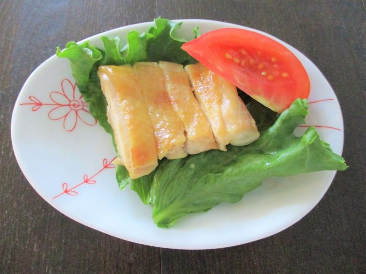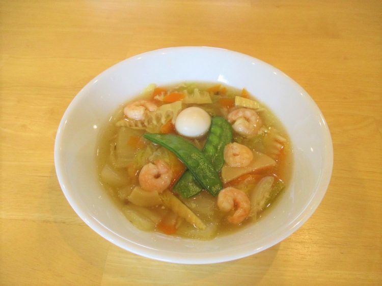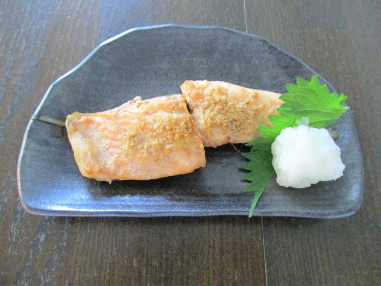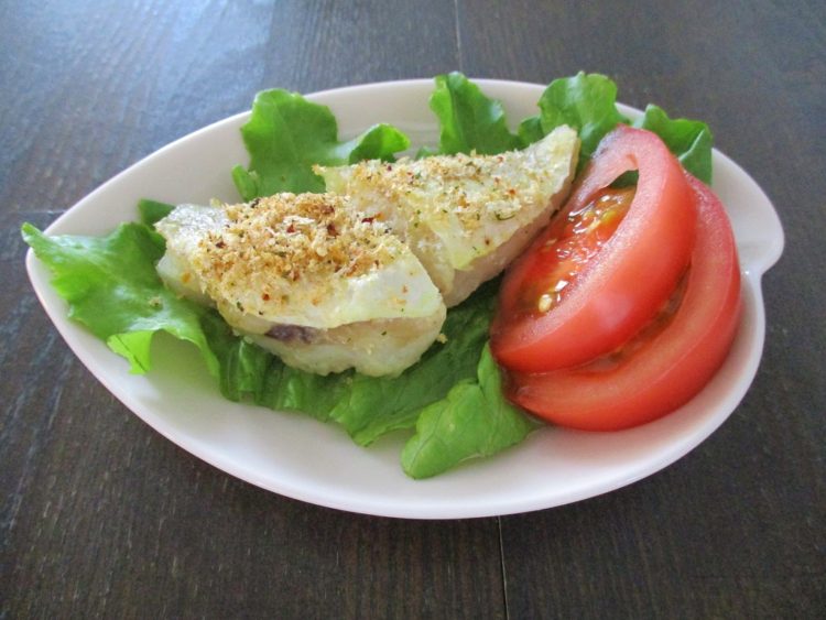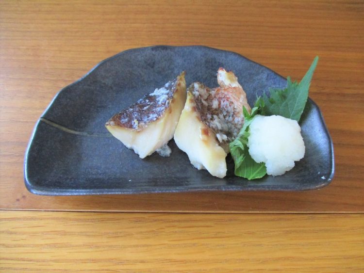 ご飯、豆腐の清汁、たいの香草パン粉焼き、うどの炒め物、玉子のしんじょ、胡瓜のサラダ、